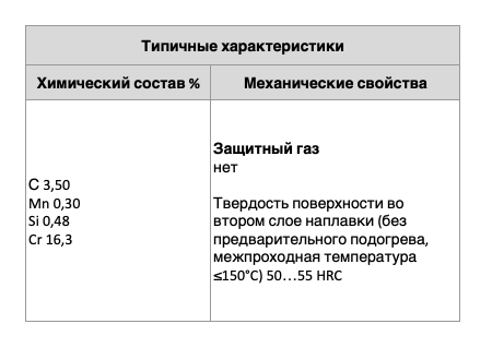 Тип - основная. Самозащитная порошковая проволока, обеспечивающая в наплавленном слое аустенитную матрицу, насыщенную вторичными карбидами хрома. Такая структура дает хорошую износостойкость в случае абразивного износа, а также при наличии умеренного ударного воздействия.