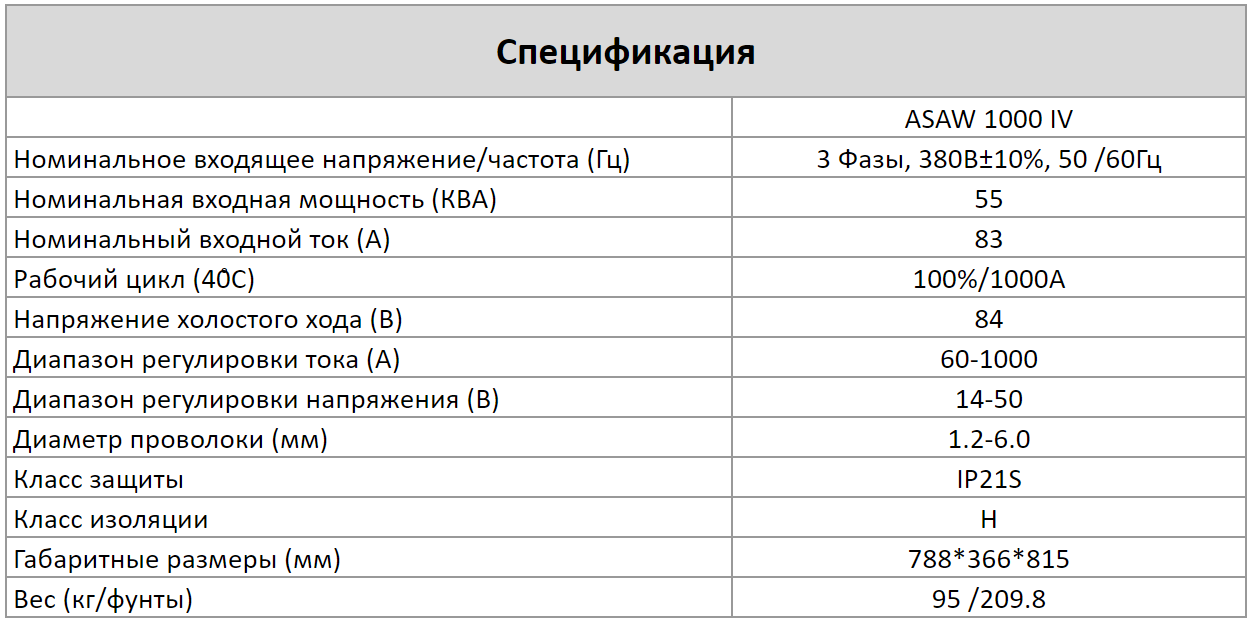 ASAW1000 IV используется при сборке трубопроводов, облицовке, работе с роботизированным оборудованием и автоматикой, сварке в защитных газах высокой мощности, ремонте износостойких материалов и в других отраслях промышленности. Он пользуется большой популярностью благодаря своим комплексным функциям и многоцелевым характеристикам. Особенности и преимущества: - Мощная сварка пластин: для сварки пластин толщиной более 3 мм. - Процесс SAW: Однопроволочная, двухпроволочная одинарная дуга, электрошлаковая сварка, наплавка лентой, процесс наплавки видимой дугой; - Процесс строжки и Сварка MIG/MAG однопроводная, двухпроводная [1.2/1.6] - Роботизированные процессы наплавки и сварки высокими токами - 3-фазный источник питания - Несколько вариантов для трактора: сварочный трактор с толстой проволокой (3,0-5,0), двухпроволочный (1,6-2,4) сварочный трактор, трактор для угловой сварки, трехколесный трактор и трактор для сварки трубопроводов. - Конструкция управления для предотвращения опрокидывания трактора (защита от короткого замыкания сварочной проволоки с обрабатываемой деталью) - В блоке управления трактора хранится 10 наборов параметров; - Совместимость с оборудованием автоматизации и роботомами: цифровые интерфейсы связи (485, CAN, CAN OPEN, DEVICENET, ETHERNET IP, ETHERCAT, PROFINET) и стандартный аналоговый интерфейс управления делают подключение робота намного удобнее. - Характеристики CC и CV; можно выбрать диаметр проволоки (1,2-5,0) - Процесс СВАРКИ под флюсом: ток запуска дуги, время запуска дуги, скорость подачи проволоки, ток остановки дуги, напряжение остановки дуги, время остановки дуги и время обратного горения. - Процесс GMAW: время предварительной подачи газа, время после подачи газа, время обратного горения, скорость подачи проволоки, время точечной сварки, напряжение для удаления шарика и время удаления шарика. - Интеллектуальная технология управления охлаждением; Экологичный дизайн - Технология плавного переключения полномостового инвертора, двойные параллельные инверторные схемы, 4 модуля IGBT, диодные модули быстрого восстановления - Защита от перегрева, перегрузки по току, перенапряжения и короткого замыкания на выходе; отображение кода ошибки.