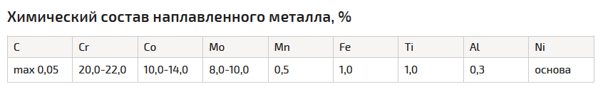 Покрытый электрод для наплавки и ремонта инструмента и деталей из жаропрочных Ni-Cr-Co-Mo сплавов, а также для сварки названных материалов с жаропрочными сталями и жаропрочными никельсодержащими сплавами. Окалиностойкость при температуре до 1100°C. Пространственное положение сварки: нижнее и вертикальное. Режимы прокалки: 320°C в течение 2 часов.