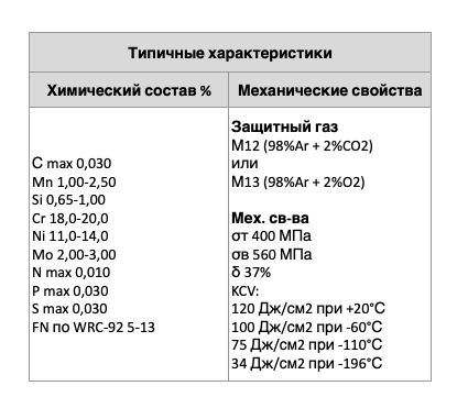 Высоколегированная аустенитная проволока с предельно низким содержанием углерода, предназначенная для сварки изделий, эксплуатирующихся во влажных средах при температурах до 350°С из кислотостойких коррозионностойких хромоникельмолибденовых сталей марок 02Х17Н11М2, 08Х17Н13М2Т, 10Х17Н13М3Т, ASTM 316, 316L, 316Ti и им аналогичных, а также хромоникелевых сталей марок 03Х18Н10, 08Х18Н9, 08Х18Н10Т, ASTM 304, 304L, 321, 347 и им подобных, когда к металлу шва предъявляются жесткие требования по стойкости к межкристаллитной коррозии. При этом наплавленных металл обладает неплохой стойкостью к питтинговой коррозии.
