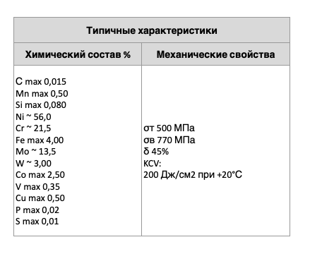 Универсальный пруток с превосходной стойкостью к влажной коррозии в окислительных и восстановительных средах, предназначенная для сварки и наплавки коррозионностойких никелевых сплавов типа alloy 22 (UNS N06022; W. Nr. 2.4602; NiCr21Mo14W), таких как Inconel 22, Nicrofer 5621 hMoW, Hastelloy C-22 и им аналогичных. Наплавленный металл обладает более высокой стойкостью к питтинговой коррозии в окисляющих хлоросодержащих средах в сравнении с проволоками типа ERNiCrMo-4.