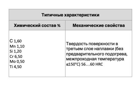 Механическая обрабатываемость наплавленного металла – только абразивом, стойкость к абразивному износу хорошая, стойкость к ударным нагрузкам хорошая.