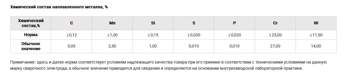 Особые свойства: Содержание ферритной фазы в наплавленном металле в исходном после сварки состоянии 5 — 8%. Наплавленный металл стоек к межкристаллитной коррозии при испытании по методу АМУ по ГОСТ 6032-89.