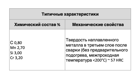 Механическая обрабатываемость наплавленного металла – только абразивом, стойкость к ударным нагрузкам хорошая, стойкость к абразивному износу хорошая, жаропрочность удовлетворительная.