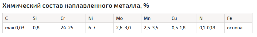 Электрод с рутиловым покрытием для сварки дуплексной стали. Металл шва имеет высокую стойкость к межкристаллитной и точечной коррозии и отличные механические свойства. Применяется для сварных соединений, работающих при температуре до 250°C. Пространственное положение сварки: все (кроме вертикального – сверху вниз). Режимы прокалки: 300°C в течение 2 часов.